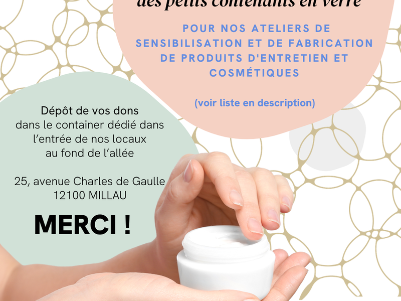 Nous recherchons des contenants en VERRE UNIQUEMENT propres et non abimés avec couvercles ou capuchons. pour nos ateliers DIY en santé-environnement.